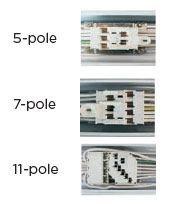 | Die Leitungen sind werkseitig 5-, 7- oder 11-polig vorverdrahtet; Stecker ermöglichen eine schnelle, werkzeuglose Verbindung mehrerer Tragschienen. | ![]() |